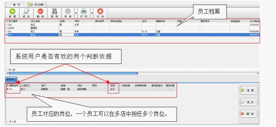 第一步建立员工档案,录入员工的基本资料,就职岗位就是一个员工所对应的岗位,在多店模式下,我们可以允许一个员工在不同的店或分公司中同时担任不同的岗位。如图所示“就职店号”(就职店号决定了该员工所对应的系统用户能否进入当前店号的系统)和“状态”是判断系统用户是否有效的两个依据,“就职店号”判断其对应系统用户是否能登陆进入某个店号的系统,“状态”判断其对应系统用户在当前店中是否有效。