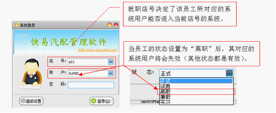 2. 在现实场景中,管理人事的职员与管理系统的管理员一定是两个不同的人,这样会导致系统用户与企业员工不相一致,有时这种不一致是正确的,但有时又是错误的。当人事职员建立起员工档案后,不是每个员工都自动具有进入系统的权利,必须通过申请并由系统管理员开设系统用户,某个员工才具有登录系统进行操作的权利,这种不一致是正确和合理的;但当某个员工提出辞职,并已经办理交接手续或已经离开企业,如果管理人事的职员没有及时通知系统管理员的话,该辞职员工所拥有的系统用户还是有效,那么就会给管理系统带来很大的隐忧,这种不一致是错误和致命的,因为该员工可以自己或通过第三者利用原来的用户登录,来获取企业的信息。如何解决这一问题:快易管理软件将员工档案与系统用户绑定在一起,当管理人事的职员将辞职员工档案中的状态设置为“离职”后,与该员工绑定的系统用户就会自动失效,这就可以完美的解决这一问题了。