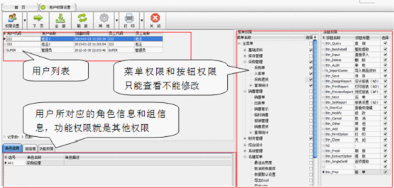 如上图所示,代码为“222”的用户与“采购经理”角色绑定,就拥有这一角色的权限。