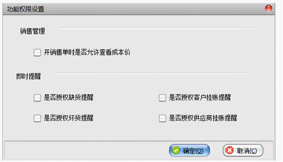 功能权限属于其他权限,在用户权限设置模块中设置(即与用户绑定)。目前功能权限内容较少,随着系统的深入发展,功能权限将会越来越多。
